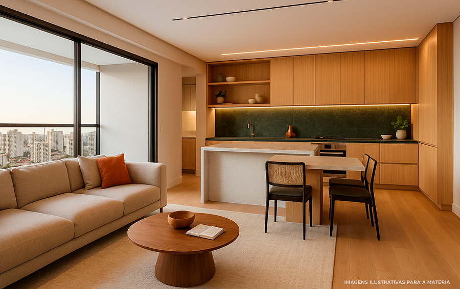 Cozinhas abertas, salas ampliadas e espaços conectados criam a sensação de amplitude e aproximam as pessoas. Essa tendência favorece a convivência, a praticidade e a otimização da metragem.