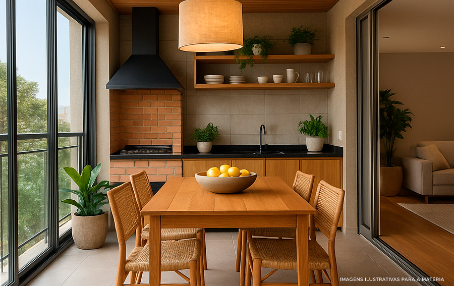 Um espaço versátil, que vai além do simples lazer. A varanda gourmet virou sinônimo de encontros: perfeita para receber amigos em um jantar especial ou simplesmente relaxar no fim do dia.