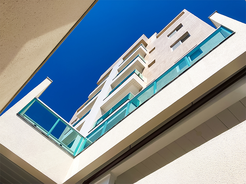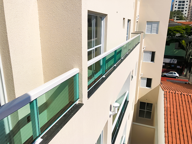 Guarda-corpo em alumínio com vidros verdes, proporcionando segurança e estilo.