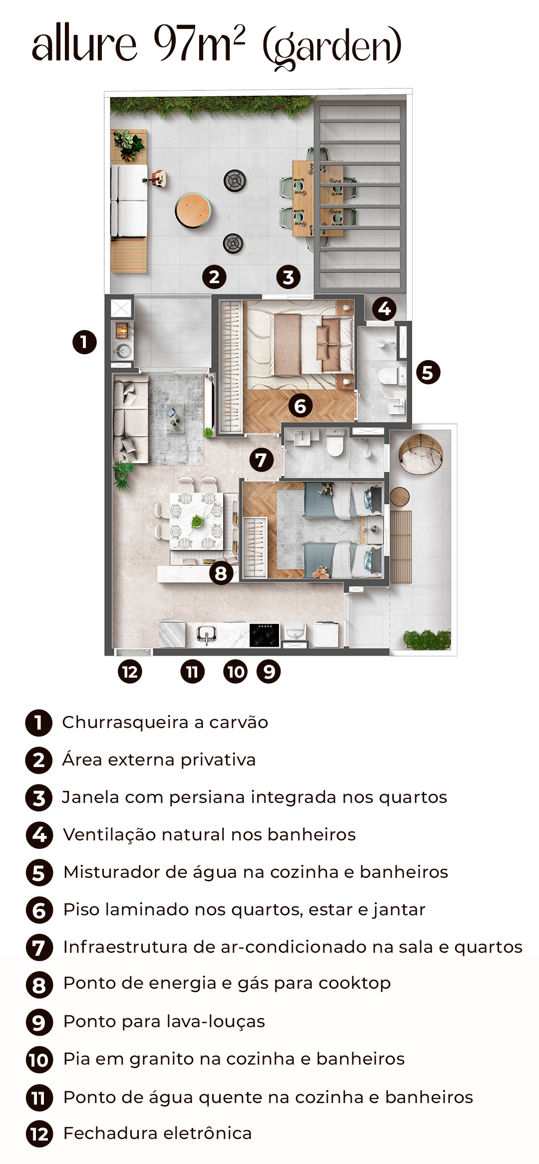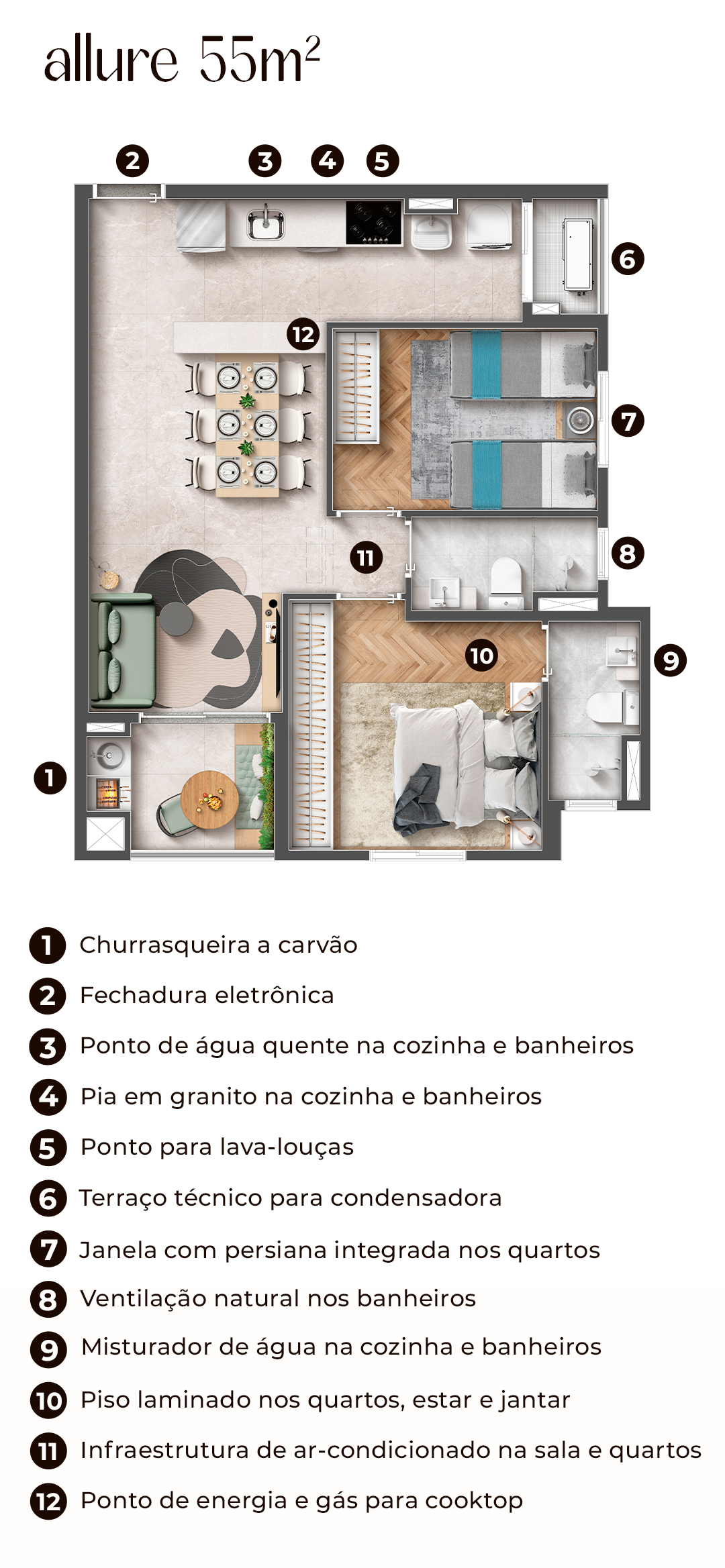 Alvará de Construção nº 1374/2022 no processo nº 802092/2021-72 de 15/04/2021 pelo Município de Campo Grande/MS. Registro do Memorial de Incorporação R.02 na matrícula 273.192 do 1º cartório de registro de imóveis de Campo Grande/MS na data de 29/04/2024. Construção: VERTTICOM C. I. ALLURE SPE LTDA. CNPJ 40.043.881/0001-42 Incorporação: VERTTICOM C. I. ALLURE SPE LTDA. CNPJ 40.043.881/0001-42. Impresso em novembro/2024. Imagem preliminares meramente ilustrativas. Todos os itens que compõem o projeto, serão entregues conforme memorial descritivo do produto e compromissos de compra e venda. As áreas comuns serão entregues mobiliadas/decoradas e equipadas conforme memorial descritivo e as cores, materiais, vegetações poderão sofrer alterações conforme disponibilidade de mercado.